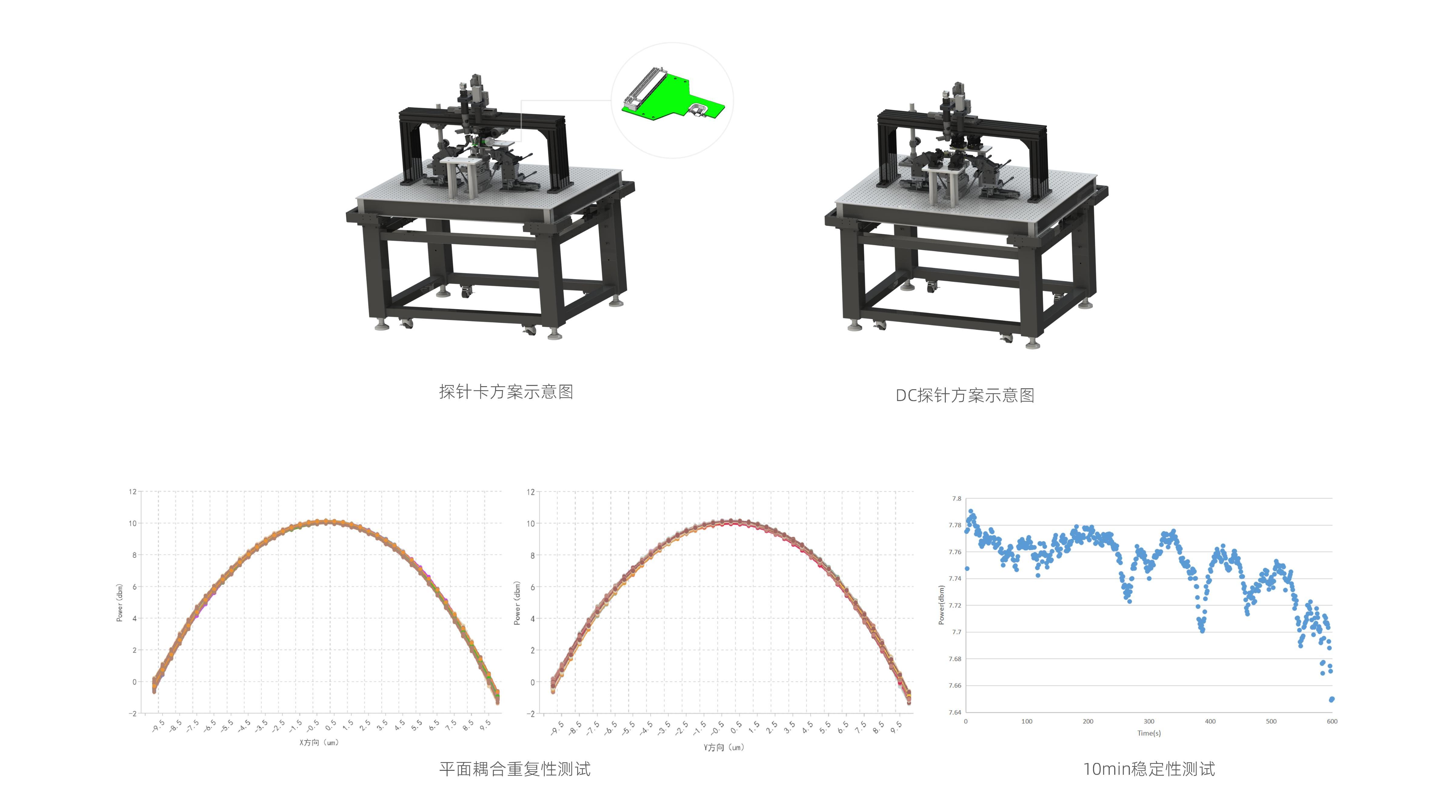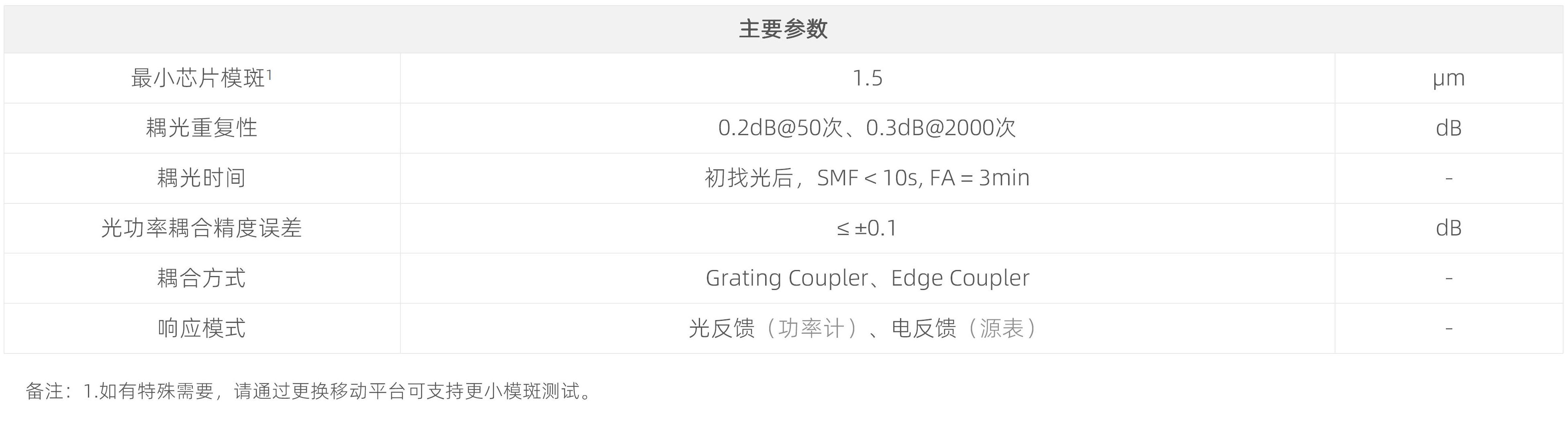CA-6000 芯片自动耦合测试系统由亚微米级高精度移动平台、高性能隔振系统、多方位视觉检测系统构建而成。该系统采用自主研发上位机软件、融合图像识别及人工智能算法,实现自动对光、自动压接探针卡等操作,中间过程无需人工参与,大大提高测试效率及精确度,进一步为客户降本增效。