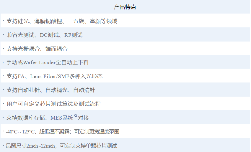 驿天诺目前已持续推出数台全自动化晶圆测试系统,可同时兼容自动化上下料、高低温、光栅耦合以及端面耦合;设备已广泛在线应用于国内外头部Fabless、IDM等客户群体;系统核心功能指标如下,欢迎广大客户垂询了解。